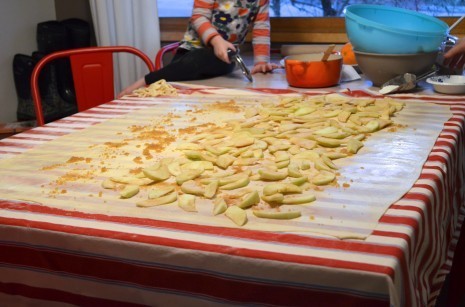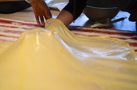 Preheat the oven to 450 degrees. Now you put a clean sheet or tablecloth on the table and sprinkle flour on it. Rub it in little. Put your dough in the center, and roll out to a circle about 18″ across. Pour some of the warm melted butter on it, and rub it in with your palms. Now, with your palms, reach under the dough and begin stretching. You want to work from the inside out, walking around the table as you go. Gently stretch and move along. You want the whole thing to cover an area about 3ft x 4ft. Just work quickly without worrying about it. I believe strudel is like pie, in that it can channel anxiety. This is not rocket science. Try to be like the women in the Old Country who just made it without comparing it to the perfect strudel of all time which they have seen on Pinterest. As you stretch, you will be making this dough stinking thin. You should be able to read a newspaper through it when you are done.