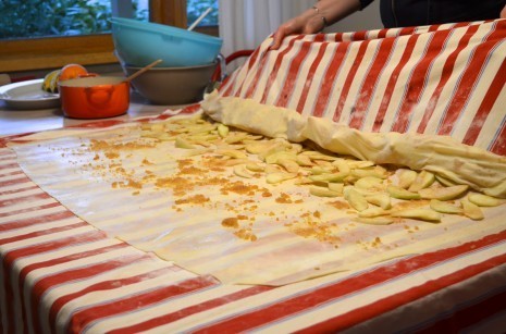 When it gets to be huge and fairly rectangular, you will want to trim the edges. I use a pizza wheel – just to cut the very edge, which remains thick, off. Now on to assembly. Get your buttered toasted breadcrumbs and sprinkle them all over the dough, except the bottom 4″ (lengthwise). Spread slices of apples on the lower half of dough (also leaving the bottom 4″). Sprinkle the cinnamon sugar over all the apples. Now fold that bottom 4″ up over the apples.