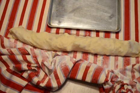 When you get to the end of the apples, stop. There is still butter! Drizzle all but a couple tablespoons on the remaining bit of pastry. Then roll it all the way up. It is possible that the side edges are supposed to be turned in too. I don’t, and the ends are delicious so I’m not worried about it, but if you like to keep things tidy, you might try that. When it is all rolled up, transfer it to a greased jelly roll pan. As you can see, you will need to shape it in an S to fit it on.