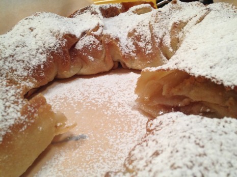 Use the last little bit of butter to brush the outside, and then pop it in the oven. Bake at 450 degrees for 20 minutes, then 375 degrees for 20 to 25 more. Cover with a clean tea towel for 10 minutes when it gets out of the oven; then cut in half and transfer with a couple of spatulas to a platter. Dust with confectioners sugar. Yum. This serves quite a few people. I make two when I do it for Sabbath dinner. A lot of people have seconds, some have thirds, and we have leftovers. So I’d say you can safely get 20 slices out of one, and, served with some ice cream, no one has anything to complain about.