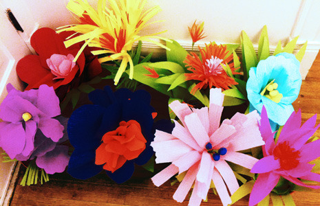 But at the same time, Granny (Ben’s mom) is getting ready for her Kindergarten class to put on a very dramatic performance of “The Empty Pot” on Friday. They needed props. So yesterday we whizzed up a lot of rhinormous and very eccentric crepe paper flowers. They help us to forget what the weather has been like in Idaho last week.