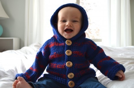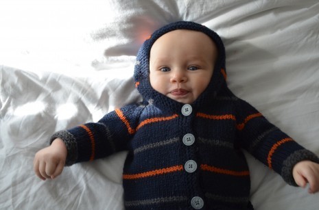 And since sweater weather isn’t exactly over yet in Northern Idaho, I had to knit him a new one. I really prefer breathable wool for smooshing into carseats – with a hat and a good blanket they are more than warm enough, but don’t get all sweaty in transit. I was in a hurry this time and thought I better use some yarn from the stash (I’ll have to tell you about that sometime). Ended up making quite the wild sweater – but it is big enough and warm enough. And the baby inside it just kills me more and more every day.