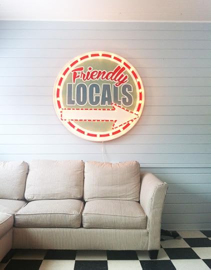 So when the moment arrived (the moment which inevitably comes into each of our lives) when I decided I desperately needed to make a big old light-up sign for the new hang-out room, what better thing to put on it than Friendly Locals? This is also because I tend to dislike enormous statement pieces, no matter how cool they may look, which don’t have any relevance to anything. I knew I wanted it round, and I knew I wanted a metal rim on it. But I couldn’t for the life of me figure out how I was going to come up with a metal edging for a huge round sign. I also didn’t want to spend any money on it. So imagine my glee when I noticed a big round white metal hoop sitting outside the Salvation Army. I zoomed in and purchased it for $2.00. It was the edge of an old patio table that had lost its middle somewhere along the line. And it was the perfect size – 4 feet across. I scored a scrap of wood at the lumber yard (the lovely lumber yard men gave it to me for free because it was just a cover sheet for their other plywood!) and there we had it! I painted on the sign, we drilled holes and installed lightbulbs, popped it into the frame, and that was it!