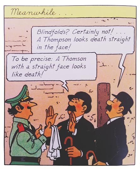 Well at some point in one of the stories, Thompson and Thomson are disguised as natives in some foreign land or other, I don’t remember which one. Egypt maybe? Anyway, Tintin bumps into them, and immediately sees through their disguise. He says, “Hello Thompson and Thomson,” to which they reply, “We’re not Thompson and Thomson! We’re friendly locals!” My kids understood this to mean, “We are twins and we match.” So, whenever they matched in any way with anyone else, they called attention to their status as friendly locals. I was epically pleased with myself when I finally figured that one out.
