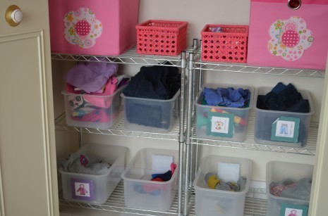 Because of all of these hugely important issues, this is what my kids’ closets look like. I need to make new stickers for their bins, as these have mostly been peeled off (it’s been a long time now). The big bins on top are for PJ’s and the little pink baskets are for skivvies. I keep all of the church clothes in one closet, with all of the tights and sweaters and special clean t-shirts. School clothes are in the laundry room closet so these are just our normal play clothes. The stickers on the front are wonderful for the kids – because I have them put away their own clothes when they are clean. It is a very simple job, and clearly one they are capable of. I should mention that there are more clothes for these girls waiting to be put away – but not that many. We keep it simple.