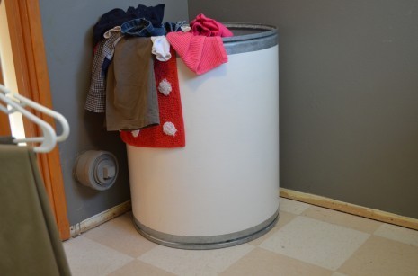 Back to the actual washing and folding of the clothes. I don’t believe in hampers in the bedrooms. Too much room for evil. I would have this feeling that the house was together, and then discover to my horror that there was actual about 4 tons of dirty laundry stuffed around the house. I’m pretty sure that hampers were for a time when the maid came through every day and gathered your chamberpot. In our very modern home, we only use the one big hamper in the laundry room. Actually, in the morning everyone throws their clothes on the stairs, and then they make their way to the laundry room, the earlier the better. Yes. This is a huge fiber drum.