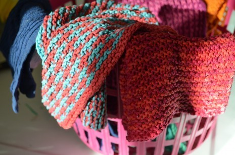 The only things that doesn’t go in here are the dishcloths and cleaning rags. Those hang over the edge of a plastic basket until they are dry. That way they never stink, and I wash them separately. You know you are in the grip of an idea when you are posting pictures on the blog of your dirty dishcloths. Yes. This is what they look like.