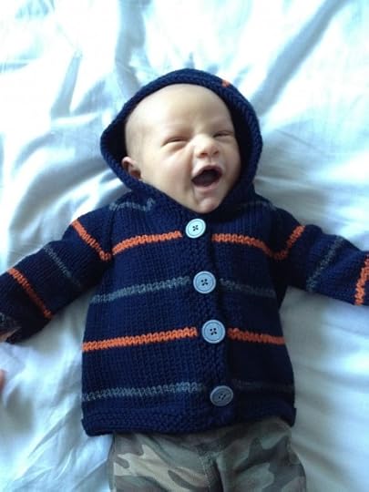 Here is my little man modeling his new sweater. He is four sweet weeks old today, keeping us busy, and old-fashioned tired. Love him! He is asleep right now, but when awake, he feels that life is not worth living unless he is nursing or being held, so I am in a hurry to pop in and leave a few short thoughts. Someone texted me a link this morning to a Christianity Today article that cites Mom, Bekah, and myself for our nasty views regarding birth and gratitude. If you, like me, are out of touch with the twitters, you can go here to read it.