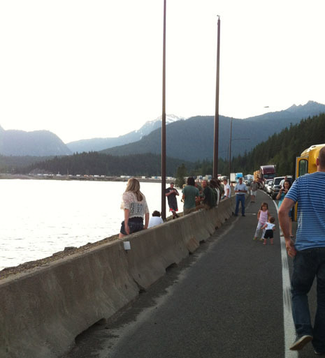 Ben and I rolled in the door from England recently . . . or rather, rolled into the Seattle airport. The plan was to hop in the car and dash home (for those not familiar with distances in the northwest, that’s about 300 miles.) But by the time we were on the road it was 7:00 p.m., we had been awake for 22 hours or thereabouts, and delirium was setting in. (On the other hand, this was absolutely nothing to some of our previous trips!) We were cruising along, radio on, windows down, trying everything to stay awake, and me diligently iphoning up distances to the nearest Starbucks. We were still in the game. Slapping ourselves from time to time in order to scare our eyeballs back into the correct positions after they started to cross. But then we hit a small and understated sign which read, “Road Closed for Blasting.” And, sure enough, as we came around the corner we found ourselves deeply ensconced in a very major traffic jam. Eventually we realized we could turn off the engine. Shortly thereafter, Ben popped his seat back and took a nap while I kept watch to make sure he would wake up once traffic started moving again. I needn’t have worried. After a smallish power nap he woke up again. People were beginning to get out of their cars. We decided to join them. We sat for a while on the concrete barrier, enjoying the summer twilight, watching as some enterprising souls up the road decided to seize the moment to go swimming.