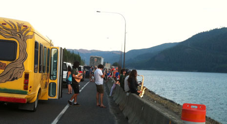 A hippie bus up ahead of us unloaded, and we watched as a guy with a guitar began to thrum out a little tune as he strolled around the road. A game of frisbee started up. People took their dogs out for runs. The guitar chap was joined by a second guitar chap. Oddly enough, a trucker actually busted out a ladder, climbed to the top, and began to adjust things on top of his rig. Bongo drums came off the hippie bus. And then a tambourine. And a sax. The hippie bus was turning out to be a sort of large scale version of Mary Poppins’ purse. Soon there was a full on hippie concert in progress. A very cute little toddler began to dance. The whole thing was weirdly surreal, especially since I was watching it all through eyeballs that staunchly refused to cooperate with each other.