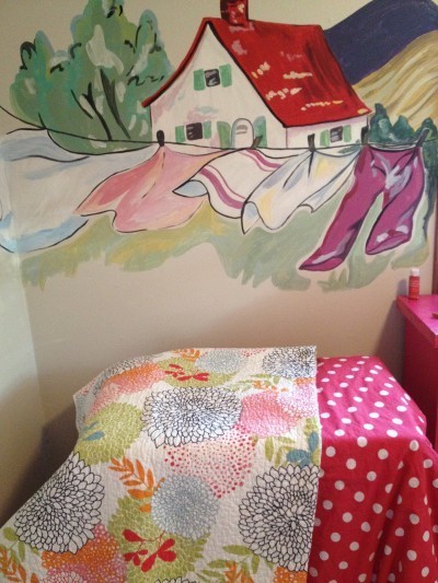 And all that bustling around she spoke of? Well – I am happy to report that some things have been done! It’s amazing but true. Some tasks have been checked off. We have moved the big girls into their own room, having first painted and put in new flooring. It’s not totally finished yet, but it is great. Here is a photo of the mural that I painted with the bedding piled up underneath it, but you get the idea.