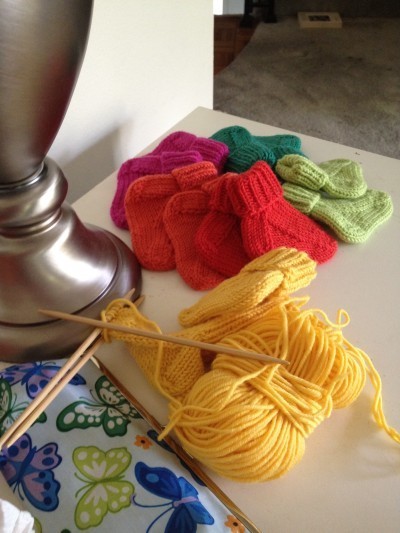 I have been knitting other things too – a new hat for our baby man on the way, baby socks for the new babies at church, and finished a scrap sweater for Chloe for fall. I have to say that the scrap part of the sweater is a bit of a false hood. I have a lot of yarn. I love to use it. So I started a sweater with the plan to use up a bunch of my super wash merino. But, after the first set of stripes I felt that solid stripes would not please me as much as heathered grey. So I ordered two new skeins of yarn to knit the stash busting sweater. Oh well! At least I only had about a yard and a half of it left so I didn’t add anything to the yarn room. Not that I would mind that.