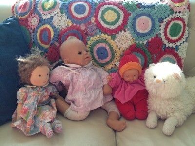 You wanted to know what Fatty looked like. Here she is. She is the one in the bizarre position second in from the left. I didn’t have the heart to round up all 37 of her pilled jumpsuits to show you, so instead I grabbed a few of her colleagues from about the house. From left to right, Sally Dot Dots, Fatty the Doll, Punko, and Petunia. I was unable to locate (I admit it, I didn’t try hard), Saucy, and Petunia’s baby cat, Patina.
