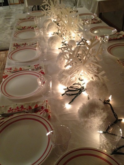 I am relieved that I am almost done with Blaire's stocking, all but the toe and the holly berries. I love that this picture captures the droopy tree, the enormous advent calendar, the stocking, and the wild party animal that is Blaire. The double-point needles that she stabbed into my yarn in a gesture of goodwill. Most of all, I love Christmas for kids. I love doing things that are outrageously tacky because the kids will love it. Like maybe stringing a full string of FLASHING Christmas lights across the kids' table at Sabbath dinner. We want them to feel like we are really classy, you know?