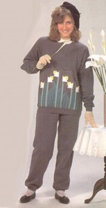 I'll bet that, in this recent season of thankfulness, you forgot to mention your gratitude that this outfit is not in style. I can't even wrap my mind around it to be honest. Cast your eye over it again. Did you forget to notice the dressy gloves paired tastefully with a sweatsuit? I'll be you did. No one expects gloves. And honestly, I'm still stalled out back at the SWEATSUIT! With tastefully appliqued floral motifs upon the sweatshirt, no less.