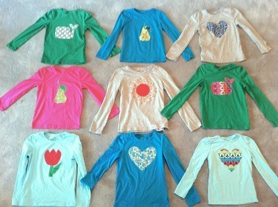 The weather is changing, revealing that there are not any clothes for the kids. For reals. None. Turns out kids grow three or four inches of leg over the summer. The clothes that we have been wearing have no life left. They should all simply be destroyed, and we should start over. We are trying. I ran to Old Navy on the first cold day and discovered that they have no children's clothes right now. Ack. So I ended up grabbing a bunch of cheap t-shirts at WalMart for the girls and did an assortment of appliqués on them. I'm hoping these buy us a little time!