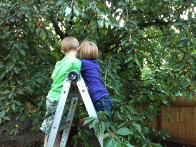 These two little hooligans are going to give the birds a real run for their money this cherry season. Or they would be if the cherries were actually ripe and the birds were interested. But we are just honing our cherry picking skills. Practicing spitting pits, climbing ladders, and other very important backyard business. Balancing on a lawn chair in the wagon is tough, and you've got to practice. Turns out the cherries don't need to be ripe for any of that!