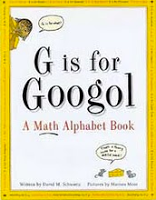 A major step down from the literary giants I've just described is my own picture book targeted at upper-elementary and middle school age children. G Is for Googol: A Math Alphabet Book is a potpourri of topics from "A is for Abacus" (proficient abacus users outcompete calculator users every time) to "Z is for Zillion" (not actually number, which provides an excuse to talk about what makes a number a number). Math-loving kids of all ages have found respite in its pages, and math teachers sometimes read from it to provide literary snacks on special days. It has spawned many a student-created alphabet-book as class projects. A 6th grade class in Colorado called theirs An Algabet Anthology by "The Awesome Accelerated Academics." At first I thought the title had a typo but I later realized that "algabet" is just a play on "algebra." Sixth grade humor. The word play continues to the final page: