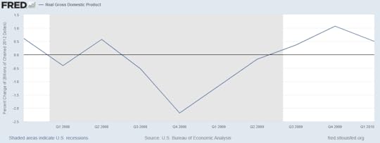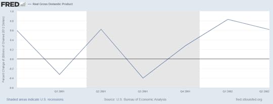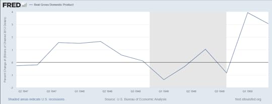 See how the blue line (real GDP) goes above the black line (zero) in the grayed area (NBER recession) during the 1949 recession in the official St. Louis Federal Reserve chart of percent change in real GDP below?
