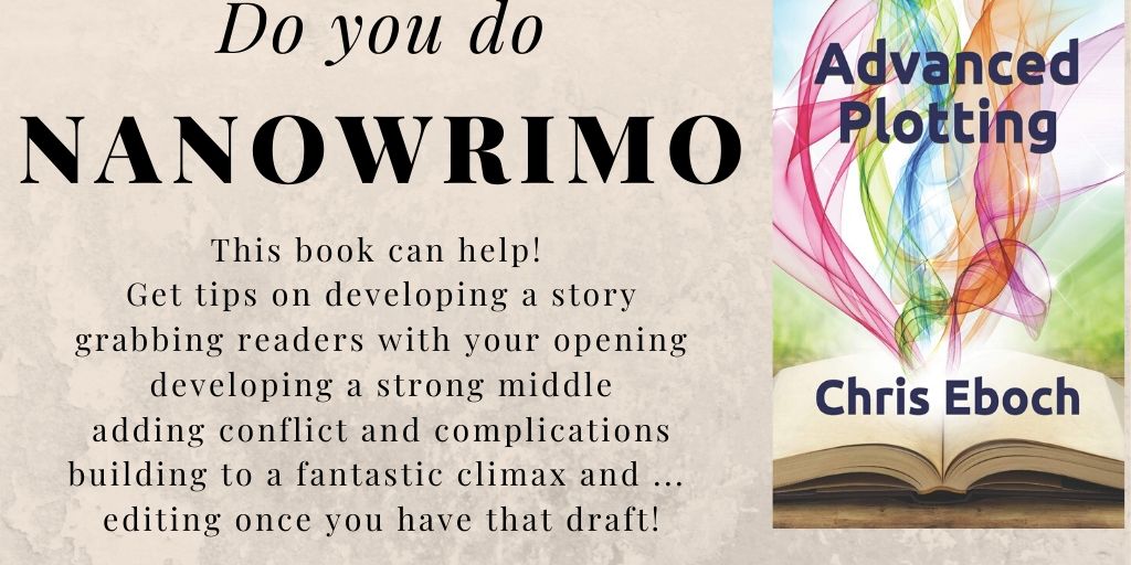 Get Advanced Plotting from Amazon in print or ebook.The holiday season can be a crazy time, when it’s hard to get any writing done. Still, it’s not too early to think about your writing goals next year. Maybe you have a NaNoWriMo manuscript to edit and polish.Or perhaps you have other projects that could use a boost before you send them out. Consider giving yourself the gift of improved writing knowledge, so you can reach your goals for the new year!