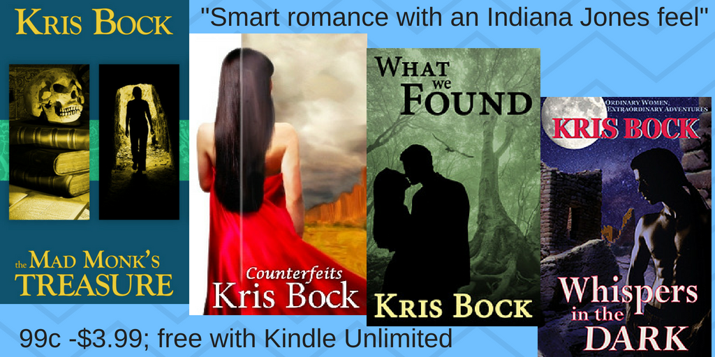 Fans of Mary Stewart, Barbara Michaels, and Terry Odell will want to check out Kris Bock’s romantic adventures. “Counterfeits is the kind of romantic suspense novel I have enjoyed since I first read Mary Stewart’s Moonspinners.” 5 Stars – Roberta at Sensuous Reviews blogRead excerpts at www.krisbock.comor visit her Amazon page. Sign up for the Kris Bock newsletter for announcements of new books, sales, and more.