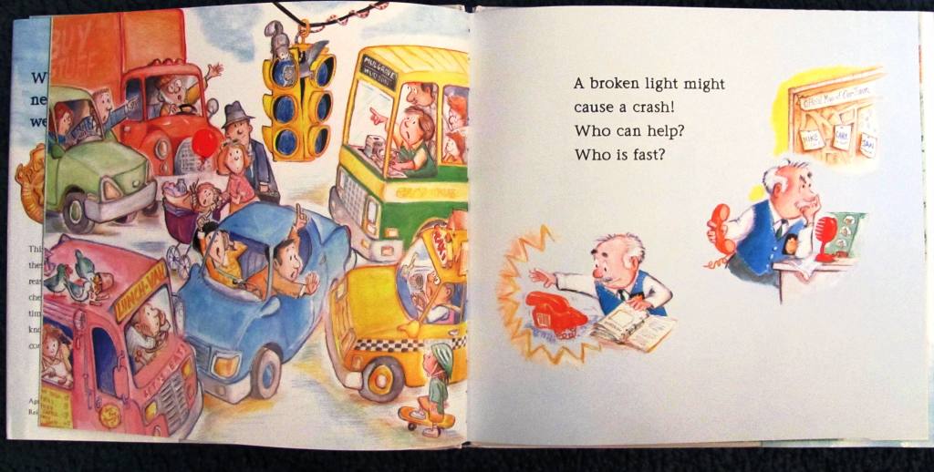 Hey, look at those last two sentences — they make a cliffhanger! The first three pages act as a sort of chapter, ending in the cliffhanger question, “Who will help prevent the crash?” This 144-word picture book has three of these episodes, each with its own cliffhanger. If you write picture books and have been told your work is "Too quiet," or if you have trouble writing a picture book under 1000 words, study Kersten Hamilton to see how much action a skilled writer can pack in to a few words.