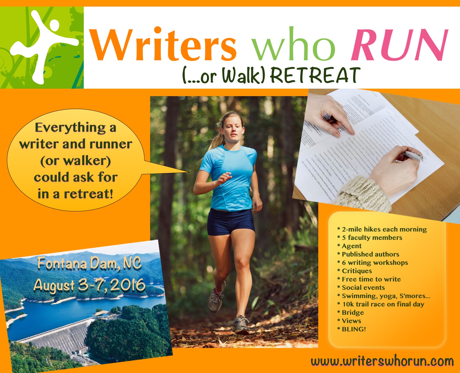 August, in North Carolina: I'll present two workshops at the Writers Who Run Retreat, August 3-6 in Fontana Dam, NC. You'll enjoy three full days packed with a morning 2-mile trail run (optional), breakfast, two 2-hour intensive workshops focused on craft and the business of writing, lunch, roundtable critique groups, free writing time, dinner, and a fun social event each evening. Learn more at the website.My programs are: