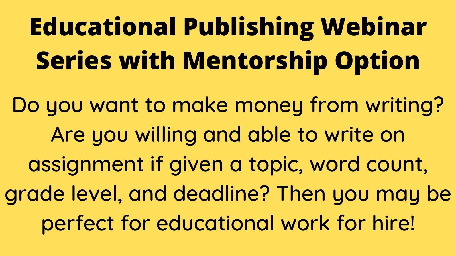 Educational Publishing Webinar Series with Mentorship Option Do you want to make money from writing? Are you willing and able to write on assignment if given a topic, word count, grade level, and deadline? Then you may be perfect for educational work for hire!