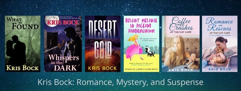 Chris Eboch is the author of over 60 books for young people, including mysteries, ghost stories, fantasy, and historical fiction. Learn more at ChrisEboch.com or her Amazon page.As Kris Bock, Chris writes novels of romance, mystery, and suspense. Her Furrever Friends Sweet Romance series features the employees and customers at a cat café as they fall in love with each other and shelter cats. Her humorous mystery series about an injured war correspondent who moves home again launches in May. She also writes romantic suspense novels about treasure hunting, archaeology, and intrigue in the Southwest. Learn more at KrisBock.com or visit Kris Bock’s Amazon page.
