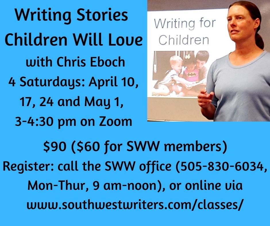 Chris Eboch is the author of You Can Write for Children: How to Write Great Stories, Articles, and Books for Kids and Teenagers is available for the Kindle, in paperback, or in Large Print paperback.Remember the magic of bedtime stories? When you write for children, you have the most appreciative audience in the world. But to reach that audience, you need to write fresh, dynamic stories, whether you’re writing rhymed picture books, middle grade mysteries, edgy teen novels, nonfiction, or something else.