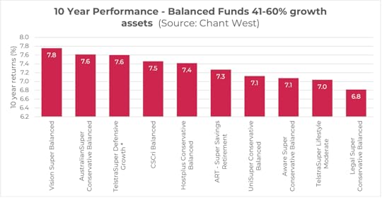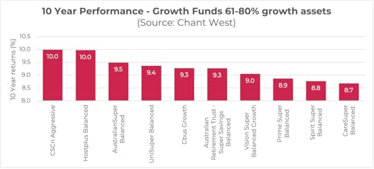It’s actually most important to start with the ten year returns, because superannuation is a long term investment, so we really cannot judge a fund on one good year. So below, I have listed the ten year performance of the funds that are categorised as ‘Growth Funds’ and, below it, the funds categorised as ‘Balanced Funds’.