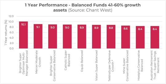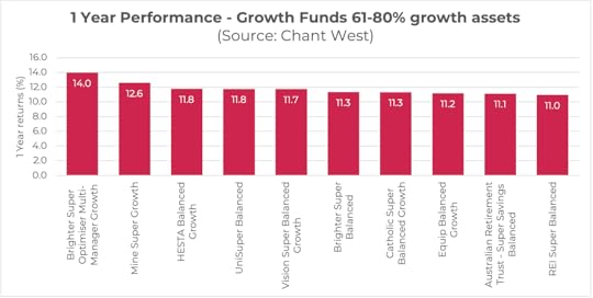 It is also important to keep an eye on which funds are performing well in the last year, which you can see below in the 1 year performance graphs for retirement phase growth funds, and, below that, the balanced funds, which have a lower exposure to growth assets. I would like to warn you against looking at one year data in isolation though because any fund can have one good year.