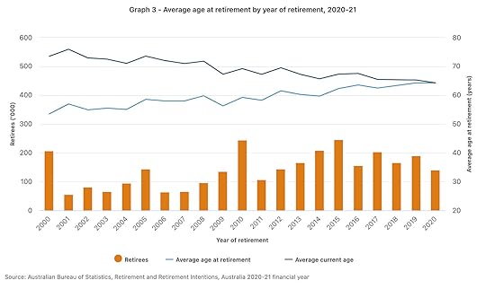 In the 2020/21 year, we saw 300,000 new people had retired since the last census, which was held in 2018/19. And 140,000 people actually retired in the 2020/21 year. The average age of retirement in Australia in 2020/21 was 64.3 years, the same as it was in 2019 and the highest it has ever been. For men, the average age was 65.4 years and for women the average was 63.7 years.