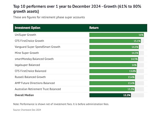 For most Aussies still in accumulation, growth funds (those with 61-80 per cent in growth assets) delivered a solid 11.4 per cent over the calendar year according to data sourced this week from Chantwest. But if you were in pension phase? Even better – an average return of 12.2 per cent.