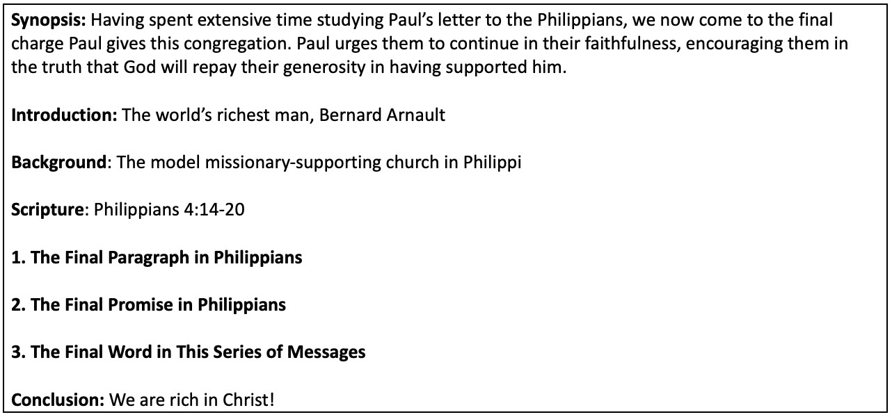 As we saw earlier in this book, the church in Philippi is the New Testament premier model of church stewardship. In 2 Corinthians 8 and 9, Paul gave an extended talk about this. Here at the end of Philippians, he is circling back to thanking them again for the financial support they had sent him while he was under house arrest in Rome. As we say, Epaphroditus had been commissioned to travel the 800 or so miles and take their gift to Paul in Rome, an extraordinary thing for a church to do.