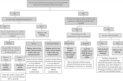 An Investing Game PlanIf you are wondering what all of this discussion of price and value has to do with how you should react to the market drop, I will argue that your response has to be tailored to (a) whether you have faith in investing (b) how much liquidity you have or need and (c) where you see yourself as having the biggest edge over the rest of the market.