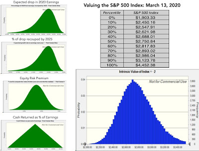 Valuing the Index While some of you will view this as a futile exercise, I revisited my S&P 500 valuation spreadsheet that I created two weeks ago, and updated it, to reflect an expectation that the earnings damage this year is likely to be larger than I initially estimated. Rather than provide a single value estimate for the S&P 500, I have run a Monte Carlo simulation around the four key inputs: earnings drop this year, the percentage that will be recouped by 2025, the percent that will be returned as cash flows and the equity risk premium: