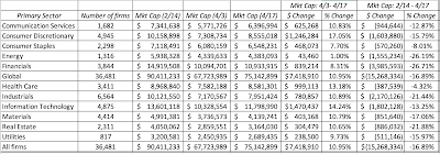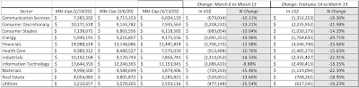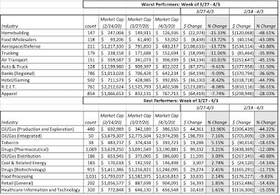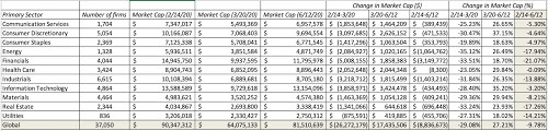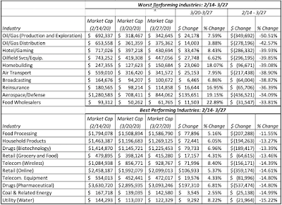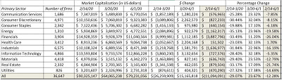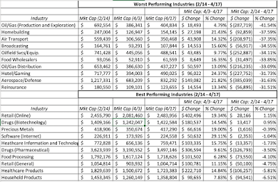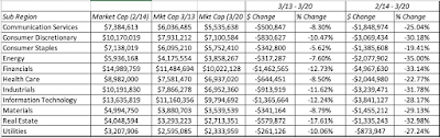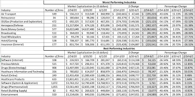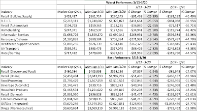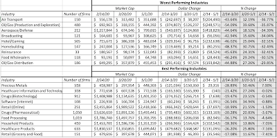 Sector/ IndustryWhile market behavior was characterized as chaotic in the first few weeks, this is clearly a market that has been orderly in how it doles out rewards and metes out punishment, as you can see in the breakdown of market cap changes by sector in the table below: