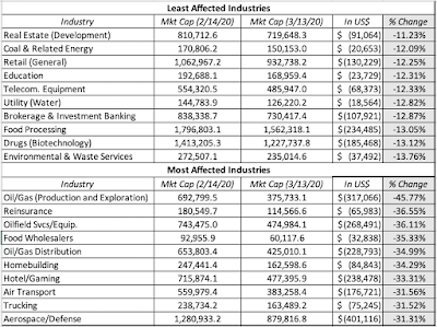 Using this framework, firms that sell non-discretionary products, are non-travel related, have low leverage (operating and financial) and are cash flow positive should be least affected by the virus, and discretionary product/service or travel-related companies with high fixed costs and debt, should be most affected. In the table below, I have updated both my sector and industry tables that I had posted last week, to reflect the additional damage from last week: