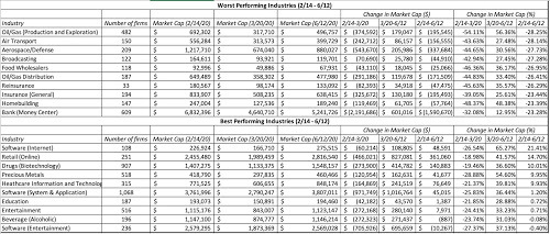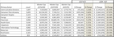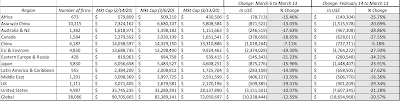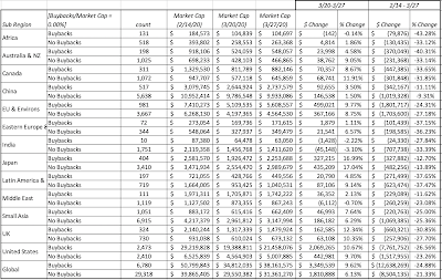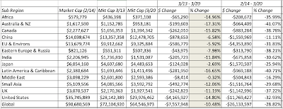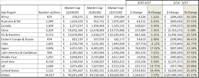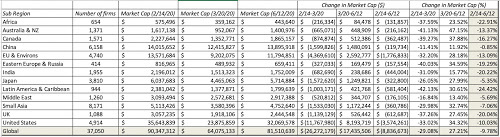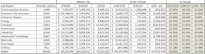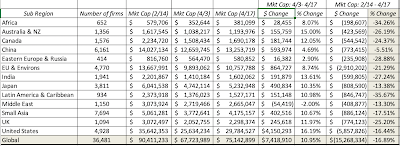 RegionThe problem with indices, especially those that contain only handfuls of stock, is that it is easy to miss changes that are occurring at smaller and lower profile companies. I used the company-level data to break down the market changes since February 14 by region: