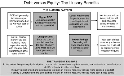 The Debt Trade OffThe question of how much a firm should borrow is one of the three questions that comprise corporate finance, but there are a number of delusions about debt that need to be dispelled first. The picture below, that I also used in last year's debt update captures what I term the "illusory benefits" of debt: