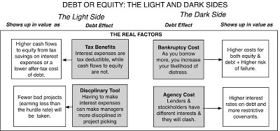 The real trade off on debt is determined by the tax benefits that are endowed on debt by tax law in much of the world, with interest expenses being tax deductible and cash flows to equity not, and the offsetting effects of expected distress costs, low for firms with stable, predictable earnings and in good economic times, and high for firms with more unstable earnings and more unstable economic settings. There are a couple of secondary factors, with debt acting as a mechanism to keep managers from taking investments that are bad enough to put the company's survival (and management jobs) at risk and the costs associated with managing the conflict of interests between stockholders and bondholders.