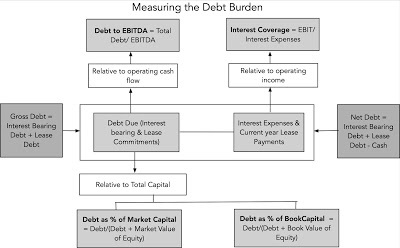 There are different measures of the debt burden, with each measure serving a different purpose. Broadly speaking, these measures can either look at debt as a percent of the total capital invested in business or look at debt payments due, relative to earnings and cash flows of the company. The first becomes an input into hurdle rates and the latter becomes a measure of the buffer against downturns and crisis: