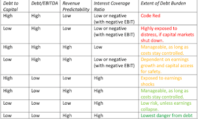Note that the predictably of revenues and earnings brings an additional dimension brought into the comparison. To the extent that some companies have more predictable earnings than others, because they sell more non-discretionary products and services, they are less exposed to risk than other companies, with similar debt burdens; a discount retailer with a debt to EBITDA multiple of four is safer than a luxury retailer with a debt to EBITDA multiple of four.