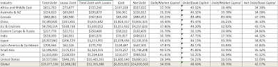 Interest Bearing Debt & Lease Commitments in 2020 I begin by looking at debt burdens, relative to both book and market capital, across the world. In making this assessment, note that I have done the following:I have counted all interest bearing debt, as reported by the company, on its most recent financial statements. I use this book value of debt as roughly equivalent to the market value of debt, because much of the debt taken by companies taken by companies is in the form of bank loans, and there is no observable market value. While there are ways of converting book value of debt to market value of debt, they require inputs on debt maturity that are not available for many companies.I have computed the lease debt, using lease commitments and an estimated cost of debt for each company, rather than trust the accounting estimates of this debt, at least for 2019. That is partly because the rule change applies only to those sections of the world that are covered by IFRS and GAAP and partly because I don't trust accountants yet, on this measure.To compute the net debt, I subtract out the cash and marketable securities that the company reports on its latest financial statements.Since debt to a financial service firm is more raw material than capital, and determining what comprises debt is almost an unsolvable puzzle, I have excluded banks, insurance companies and brokerage firms/investment banks from my sample.Recognizing that the most recent financial statements for most companies in my January 2020 update are from September 2019 and with the even more important caveat that the market capitalization, while updated through March 16, 2020, is a moving target in a market like this one.