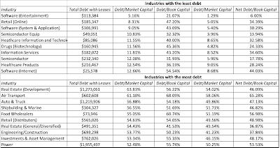 Download spreadsheetNotice the preponderance of technology firms on the least levered list and the bunching up of infrastructure and manufacturing companies on the most levered list. All of the numbers reported above for debt include my estimate of the lease debt, and since the accounting rule changes this year have brought lease debt on to balance sheets, I can compare my estimates to the accounting numbers. For non-financial firms collectively, my estimate of lease debt is about 60% higher in the aggregate that the accounting estimates, reflecting partly the additional information that accountants have on lease specifics that I do not, partly the fact that there are segments of the world where leases are still not treated as debt and partly the complexity of accounting rules on lease debt.