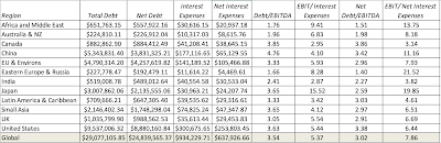 Earnings and Cashflow Coverage As we noted earlier, companies that look lightly levered, when debt is measured against capital, can still face a significant burden if their earnings and cash flows are insufficient to meet debt payments. In the table below, I look at the regional differences on debt as a multiple of EBITDA and interest coverage ratios: