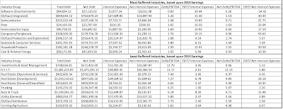 Download spreadsheetWith the caveat that the EBITDA and operating income numbers are from 2019 and do not reflect the damage that is going to be caused by the virus, companies in Africa/Middle East and Eastern Europe have the least debt, relative to EBITDA, but Japanese companies have the most buffer, based upon interest coverage ratio. Canadian and Indian companies have the least buffer, on an interest coverage ratio basis. Extending this analysis to industries and looking at the ten industries with the most buffer and the ten with the least: