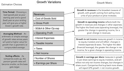 So what? First, it is worth remembering that that the biases an investor brings to the table will often determine how, and in what metric, growth is computed. In general, at least in good times, earnings per share growth will be the mantra of bullish investors in a stock, whereas top line growth will the number offered by more pessimistic about the stock. Second, if you are using growth rates for companies from a data service, it is always worth asking questions about the approach used to compute growth (arithmetic or compounded) and time period used (starting and ending years), since they can skew growth rates up or down.