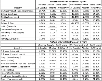 Growth Rates - A Global OverviewIn keeping with the theme that with growth rates, it behooves us to be transparent about estimation choices, I will start by explaining my choices when it comes to growth. For historical growth rates, computed at the start of 2020, I use the compounded average growth rate in the previous five financial years. For most firms in my sample, this is the geometric average growth rate from 2014, as the base year, to 2019, as the final year in the sample. I will also compute growth rates in revenues (top line) and net income (the proverbial bottom line). With the latter, there will no growth rates computed for companies that are money losing, since the growth rate becomes a meaningless number. With that lead-in, I start by estimating growth rates by industry group, and in the table below, I list the ten industries with the highest growth rate in revenues in the last 5 years (2014-19) and the ten with the lowest: